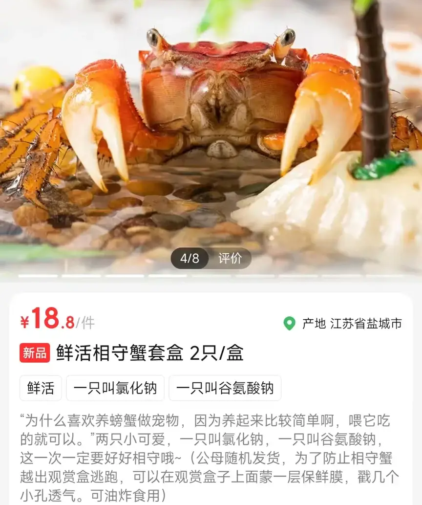 在去年 520 之际,叮咚买菜上架了两只相守蟹,学名相手蟹,还用了热播剧《一生一世》里男主周生辰养的两只螃蟹名“氯化钠”“谷氨酸钠”来命名。