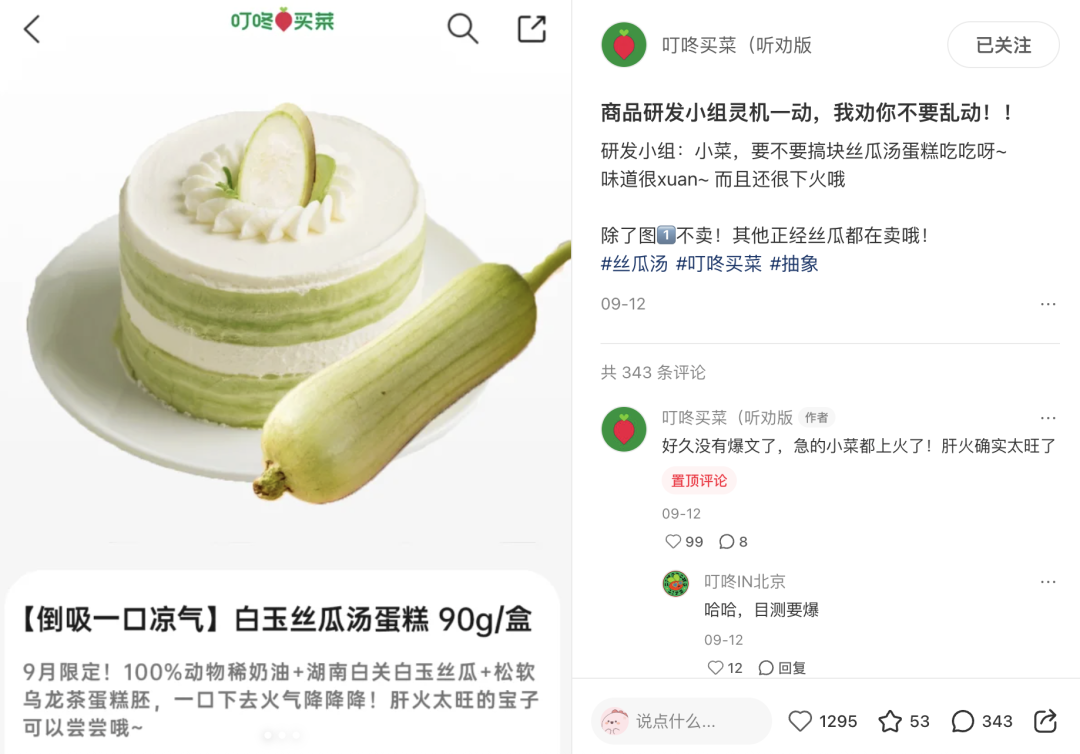 能被网友叫“癫咚”,自然也离不开它接地气的网感运营。不光商品详情文案写得有趣又抽象,还经常追热点玩梗。前段时间网络上对丝瓜汤的讨论度很高,叮咚买菜也巧妙地蹭上了这波热度,推出“丝瓜汤蛋糕”下火(实则没有,在玩抽象)。