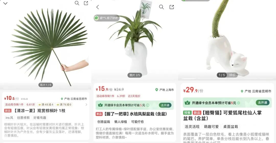 还有一些自带 ins 风的绿色选品,一枝四处漏风的棕榈叶、名为“握了一把草”的水培凤梨盆栽、翘臀猫造型的仙人掌盆栽,击中打工人优雅发疯的工位情绪。