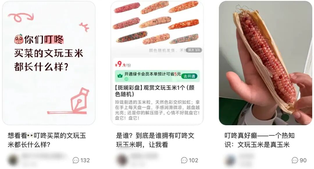 最近,叮咚买菜上架了一款文玩玉米,上线仅一周,销量就较首日暴涨 300% ,拿下站内鲜花绿植飙升榜第一名,直接把“盘玉米”这个话题带火了,社交平台上全是网友晒出的盘玩成果。