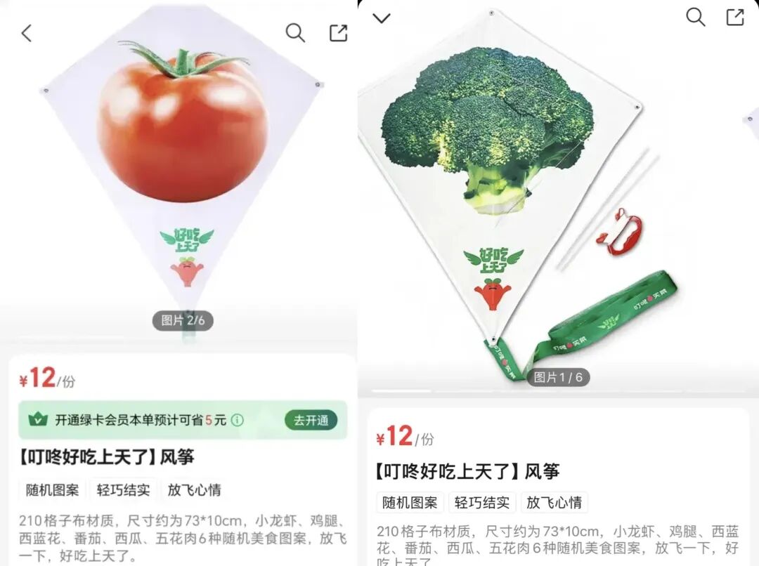 连踏青装备都有,印着生鲜图案的「叮咚好吃上天了」食材风筝,这下是真的上天了。