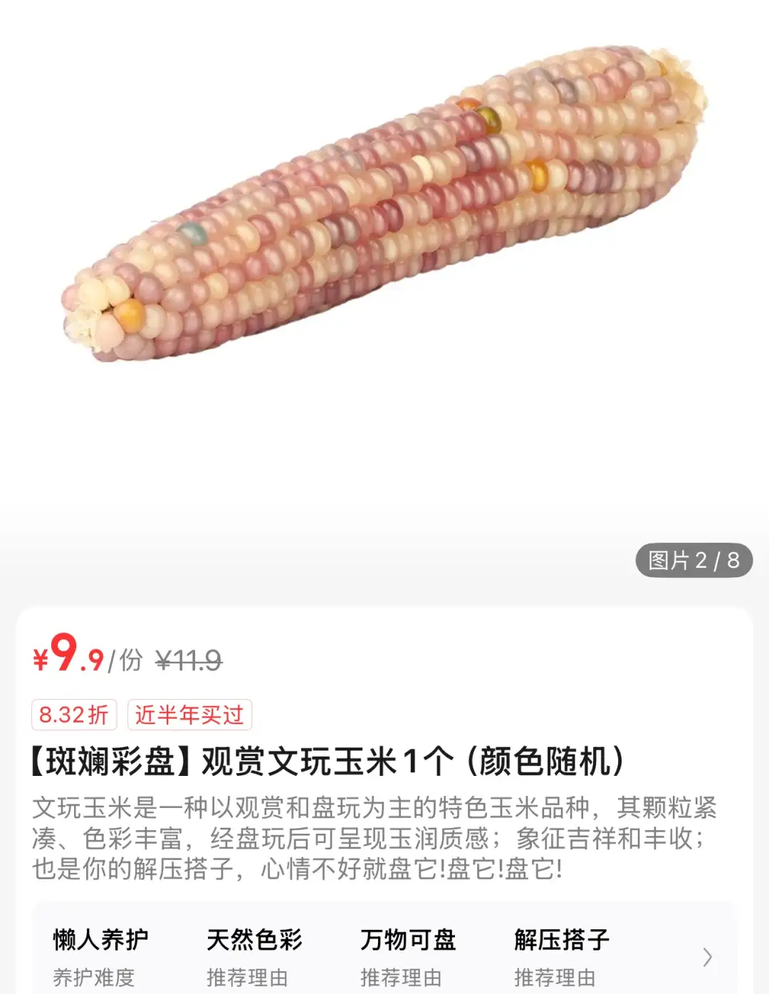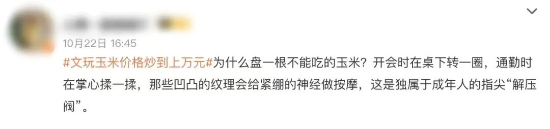 不是文玩盘不起,九块九更有性价比。就像网友说的,一根不能吃的玉米能成为独属于成年人的解压方式,给紧绷的神经做按摩。