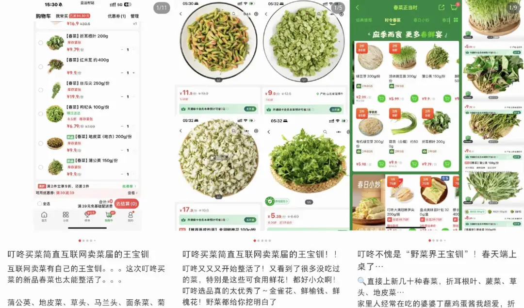 在去年春菜季,叮咚买菜上架了一堆野菜,被网友集体点赞,纷纷为其冠上“互联网卖菜界的王宝钏”的名号,引发了大量的讨论和传播,极大地提升了品牌的知名度。