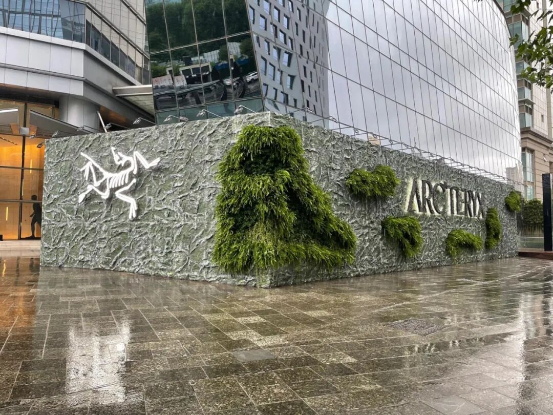 始祖鸟的另一围挡用绵密植被点缀岩壁。水泥高楼之间,仿真的立体围挡营造出户外氛围感。