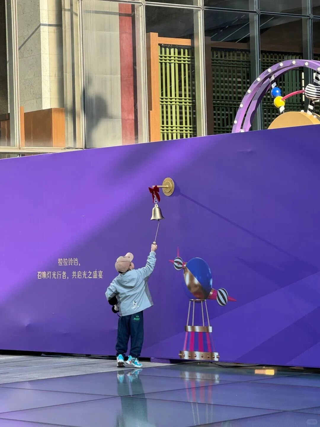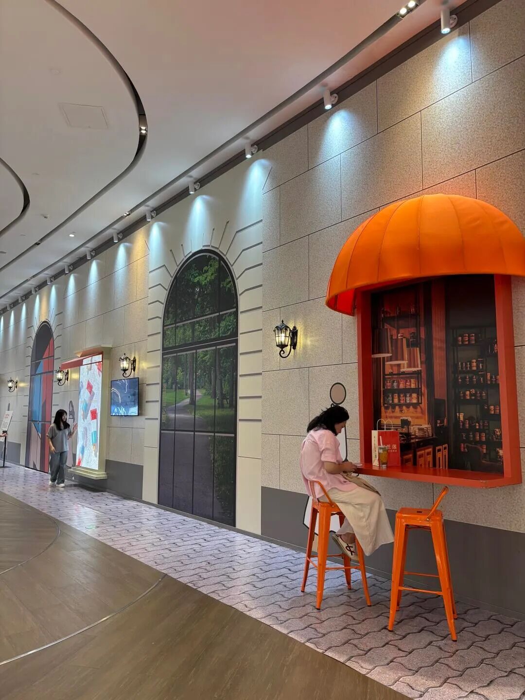 商场围挡设计假门假窗玩穿越,消费者坐着休息让整个画面变得完整。