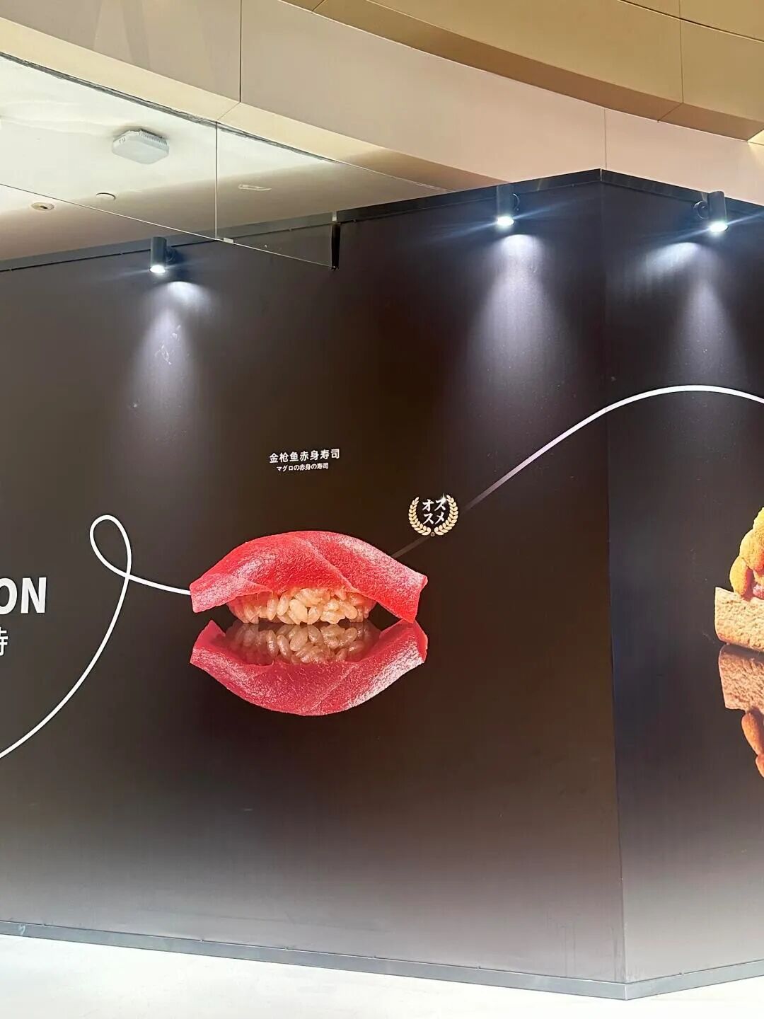最近,有网友吐槽成都万象城中的寿司店围挡,画面上 一贯寿司被P出倒影,乍一看好像红唇黄齿,令人不适。
