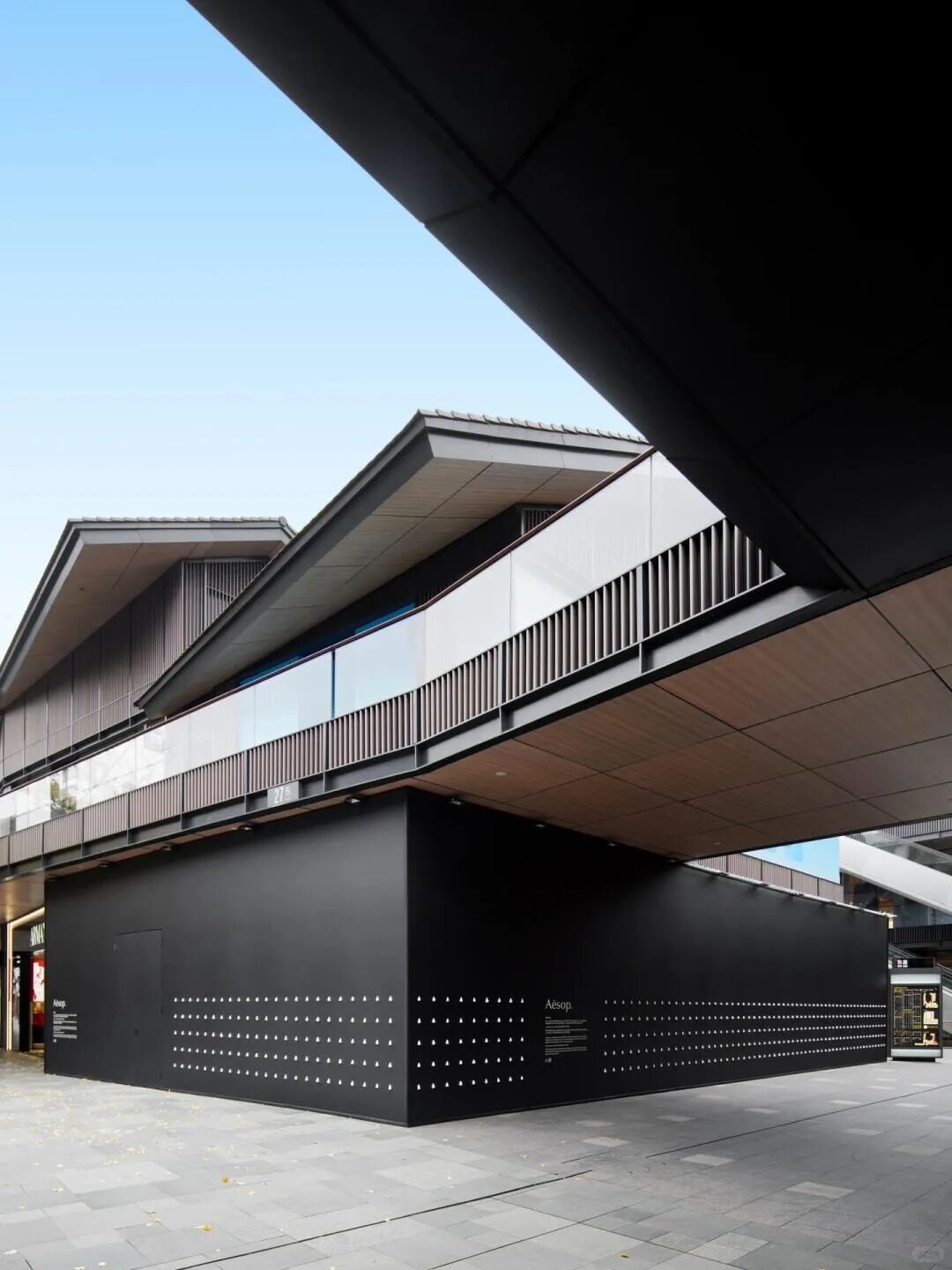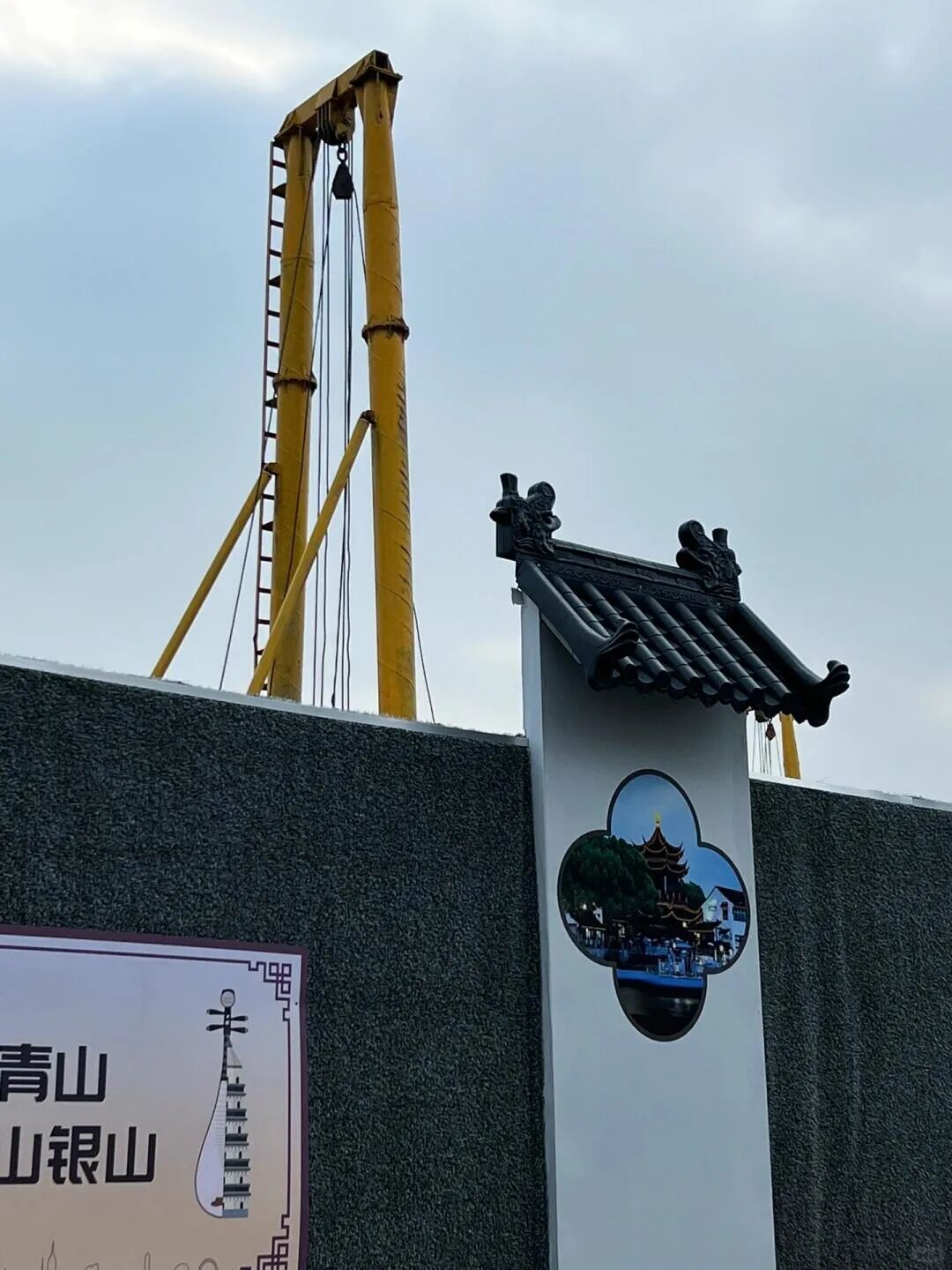 苏州的一处建筑围挡中间拼接了一块古典园林风格的白墙灰瓦和飞檐翘角。