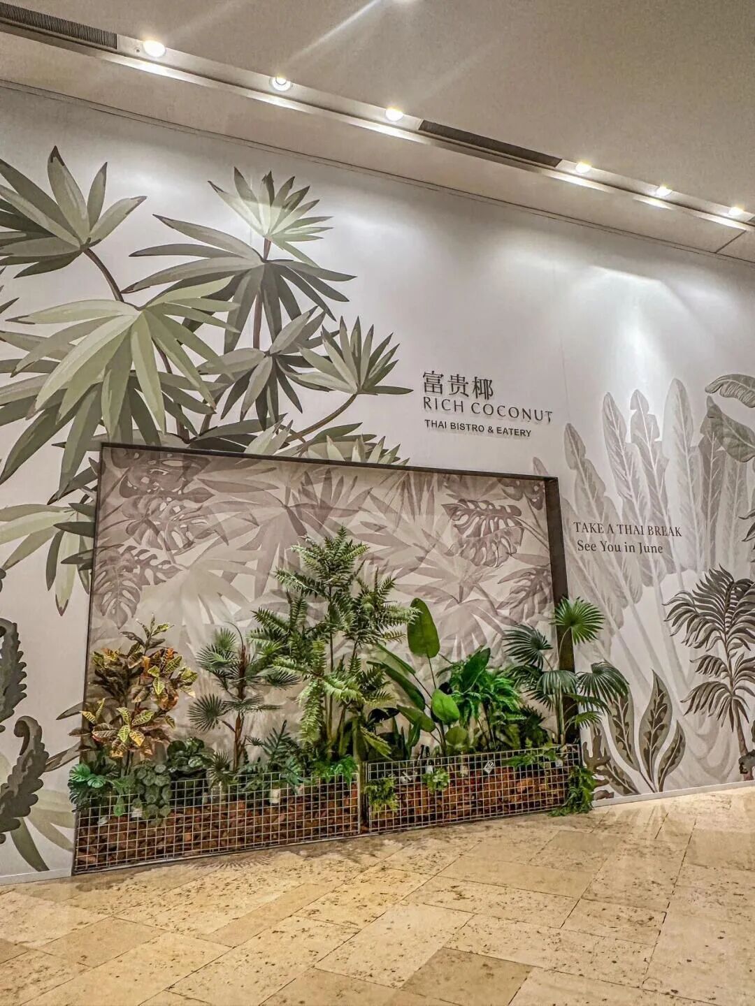 南京德基广场的泰式菜餐厅富贵椰让植物先进场,预告餐厅内松弛感满满的绿植氛围。