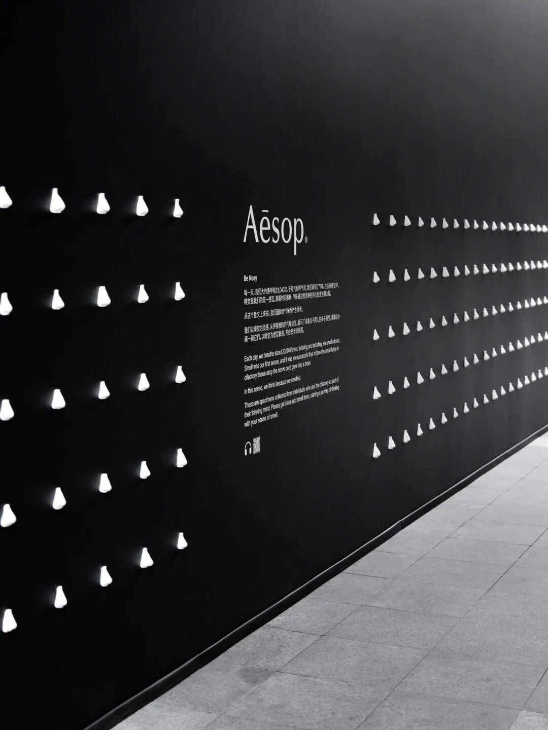 化妆品品牌Aesop在围挡上 打造了一场互动艺术装置“Be Nosy”,445个真人鼻子大小的雕塑鼻子被安在围挡上。品牌还在鼻子上喷上独特的香氛,引导路人们“跟着鼻子走” 。