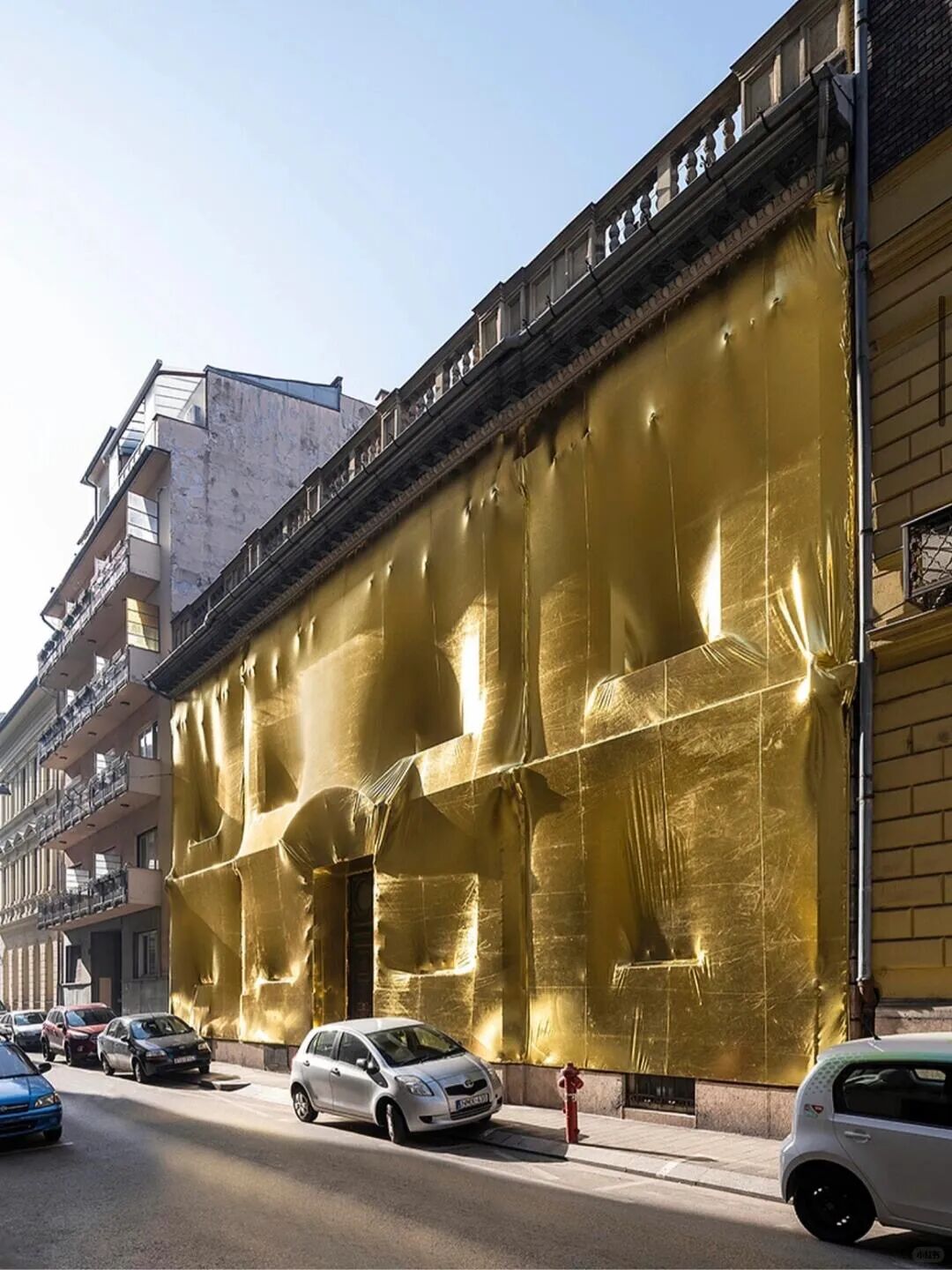 位于布达佩斯市中心的一座古老宫殿,建筑师用金色布料包裹宫殿外墙,这种布料既可以当防水罩也可以替代建筑安全网。太阳底下金光闪闪,好像一座新的艺术装置。
