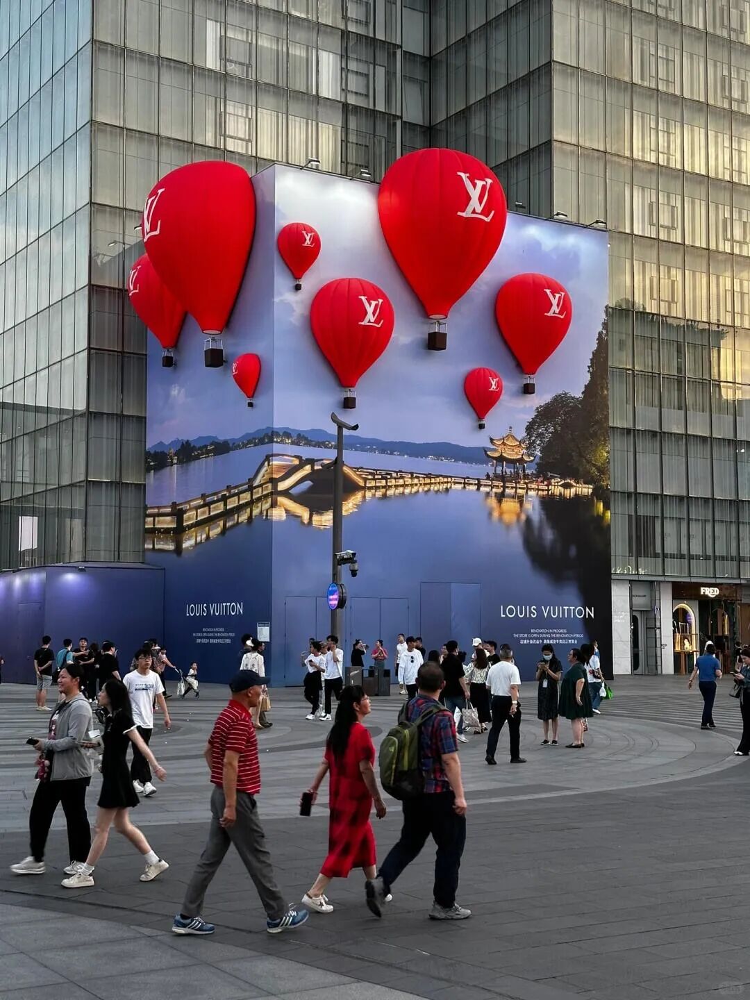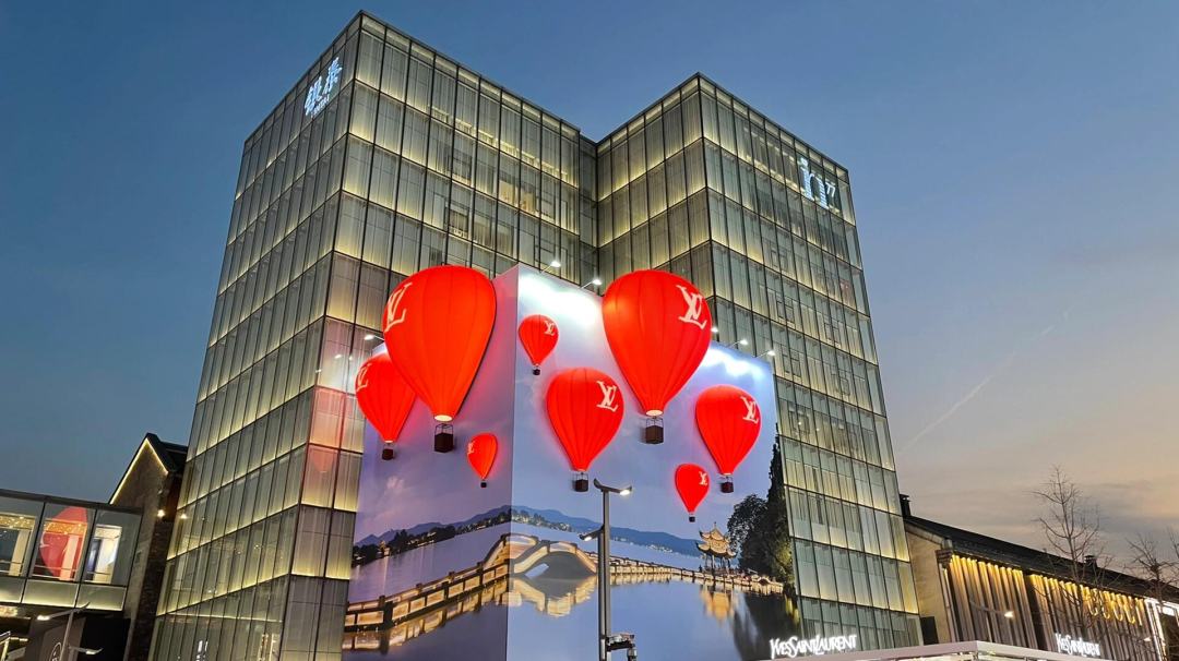 LV秀场的红色热气球飘到了杭州西湖上空。夜晚,热气球亮灯,显得十分浪漫,点亮了整个商圈。