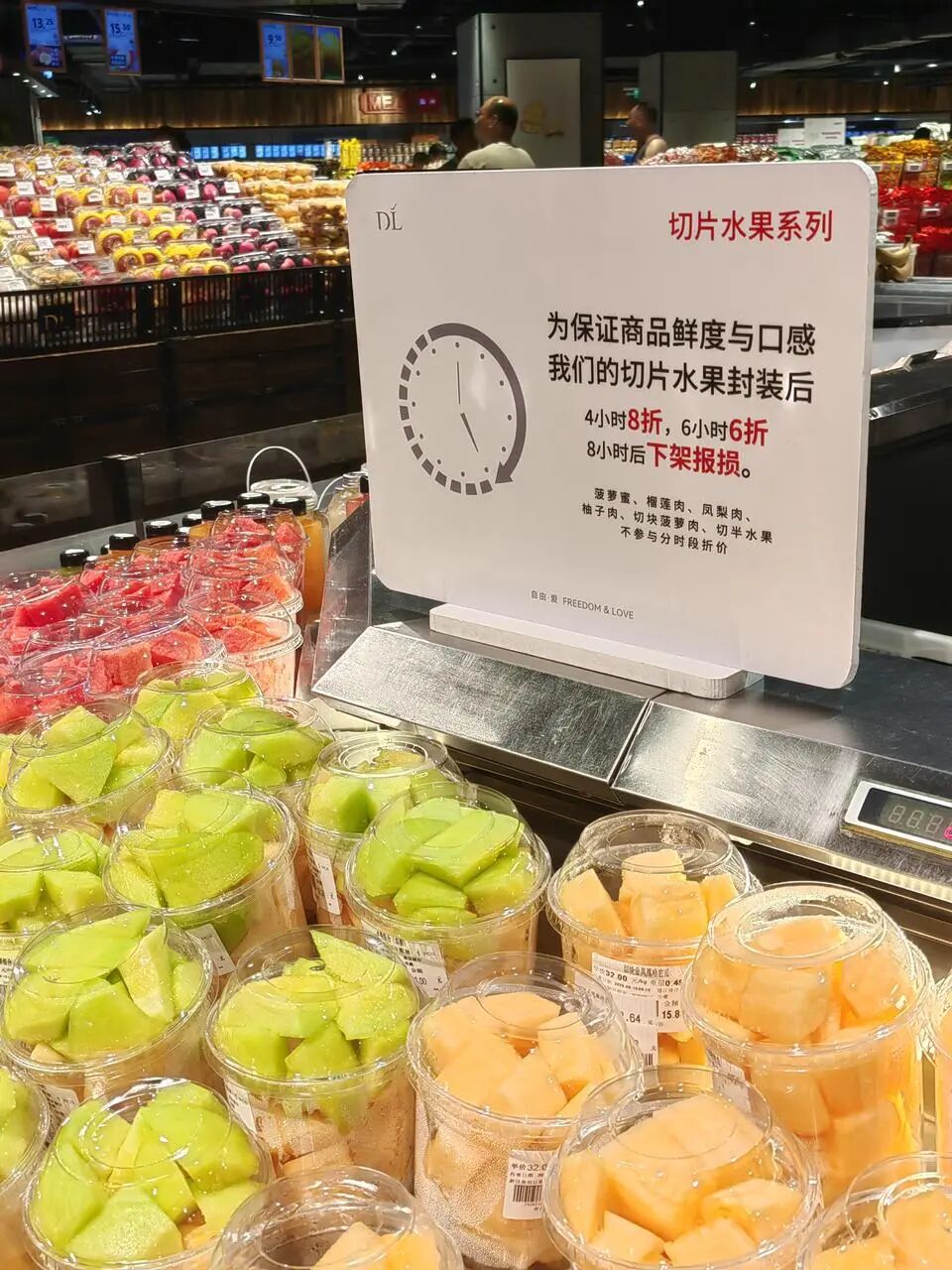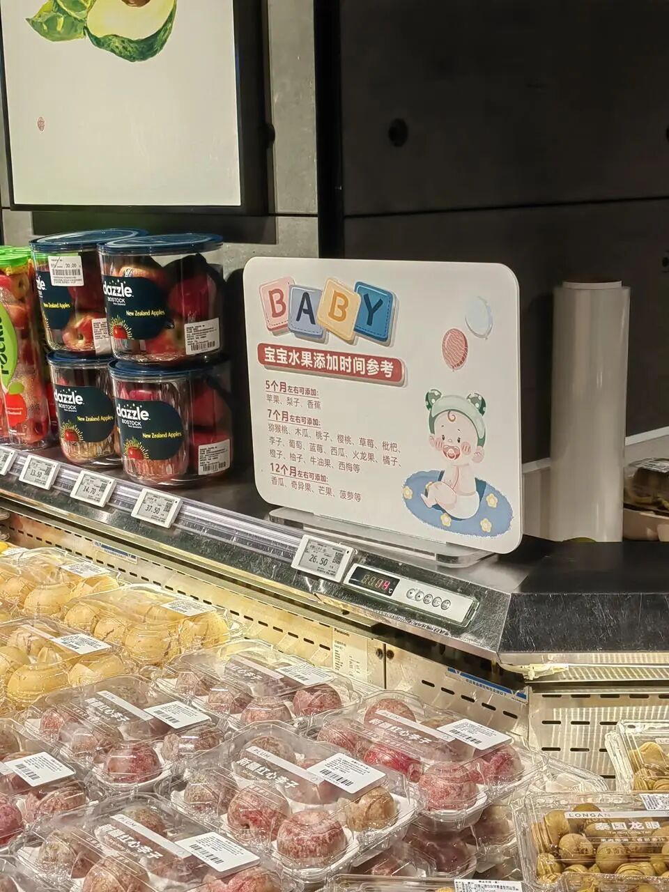 鲜切水果4小时打折,8小时报损。几乎每个品类的商品都会标注使用方法、保存方式。水果区针对婴儿食用水果的提示精确到月份,奶粉区也提供了相当详细的冲调步骤。