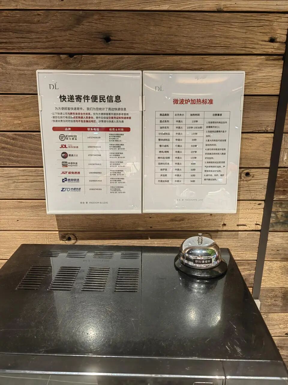 洗手池区域提供直饮水、发绳、护手霜。智能化的洗手间实时显示空位和环境情况。微波炉加热区域会提示各种食材的加热标准,并为有寄件需求的顾客细心整理了快递信息。