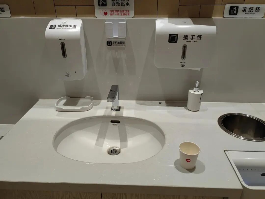 但只要仔细观察,就会发现细微处的不同。比如洗手台的水渍无人清理,杯子拿完没有及时补货。而这些情况在胖东来几乎不会发生。