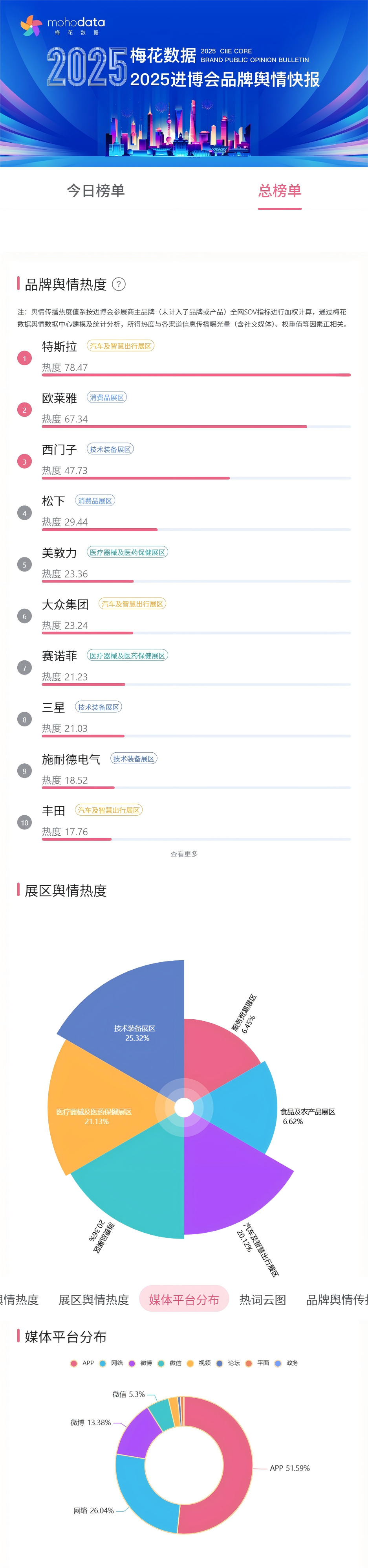 2025年上海进博会已在昨日正式开幕,各参展品牌结合进博会核心精神与品牌特点展开营销传播,根据梅花数据最新推出的进博会核心品牌传播榜单,截止11月6日10时,特斯拉、欧莱雅、西门子、松下、美敦力进入总榜单前五,详情欢迎查看榜单页面。