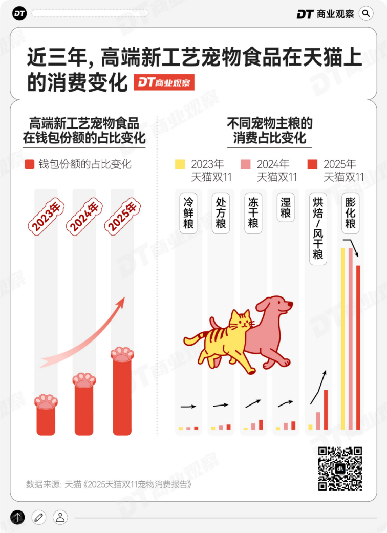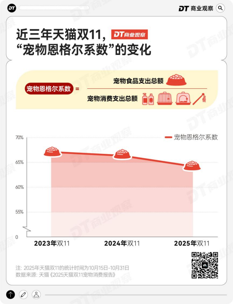 一个可以印证的数据是天猫平台上,宠物恩格尔系数——宠物食品支出占宠物消费总支出的比重,下降了2.93%。
