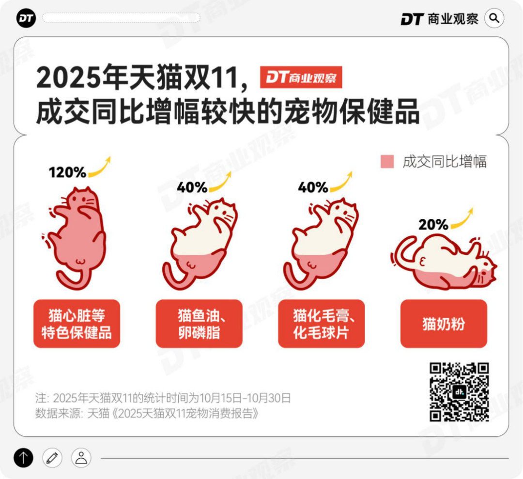 比如保健品,从养猫人基本都会入手的鱼油、化毛膏,到进阶的益生菌、黑鼻头护理和情绪安抚……近50000种宠物保健品在天猫双11热销,堪称一场关于“宠物养生”的全民科研。