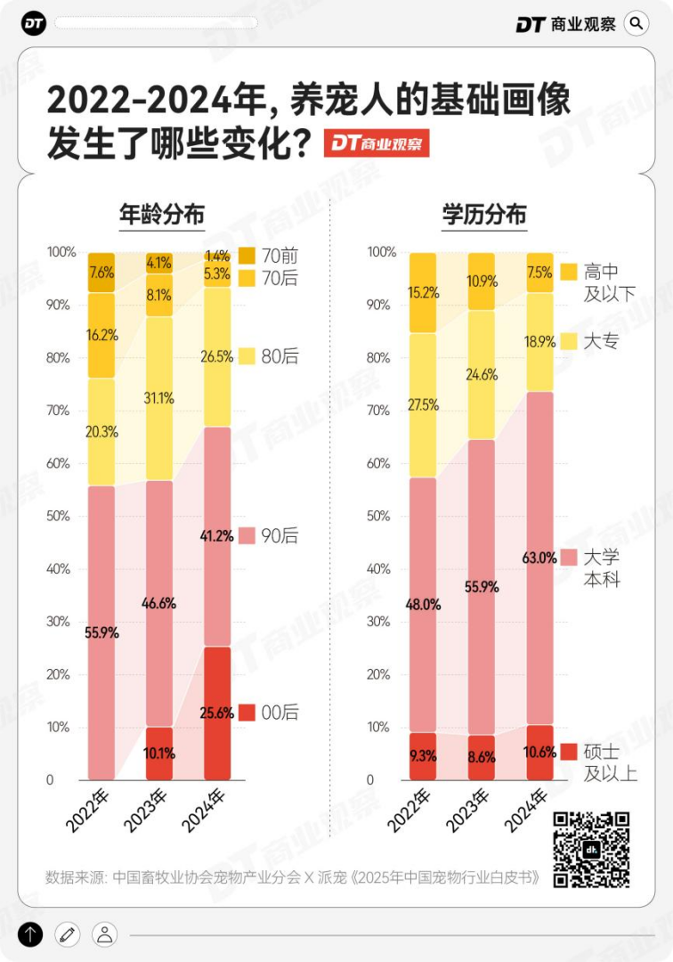 参考《2024中国宠物行业白皮书》,截至2024年,养宠的主力军以00后和90后为主,且00后的占比快速攀升,已经占到全年龄段的四分之一。同时,大学本科和硕士及以上学历的养宠人占比超过7成。