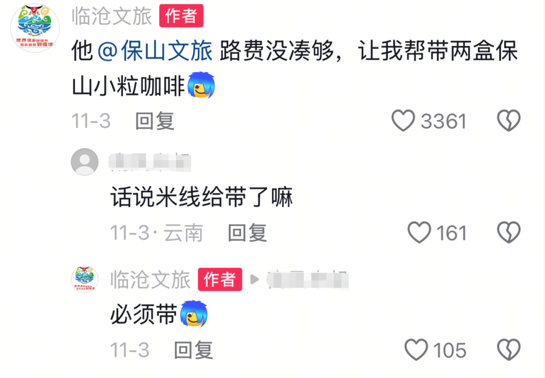 除了直接赞助的骆驼,@临沧文旅 在比赛中途以“老乡”身份探望冷美人, 替她向网友报平安,还带上了她心心念念的鸡肉米线,以及@保山文旅 让带的保山小粒咖啡。@临沧文旅 的 官方下场,拓宽了地域知名度和美食文化。