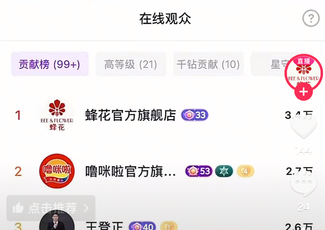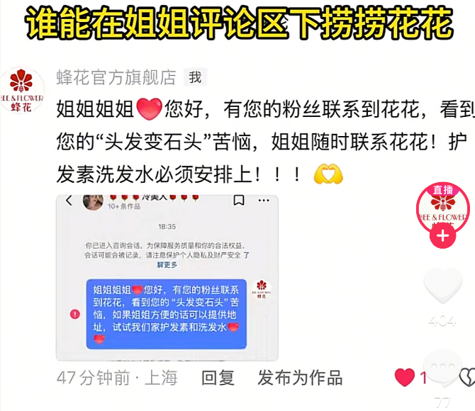 在冷美人的病房洗发直播中,蜂花、香飘飘等品牌在直播间刷礼物,蜂花把自己刷成了榜一。