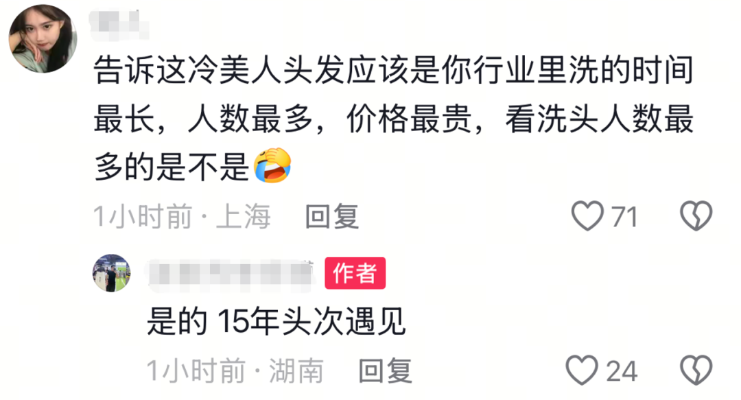 网友评论,这应该是你行业里洗的时间最长,人数最多,价格最贵,看洗头人数最多的。理发师表示同意,“15年头次遇见”。