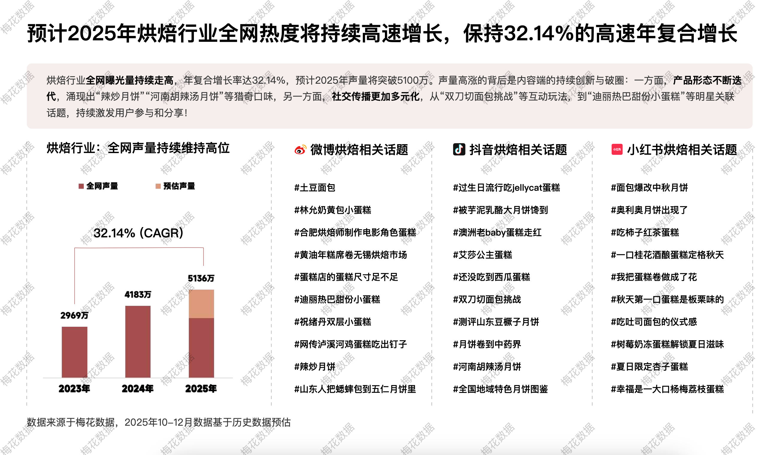 尽管烘焙行业趋于稳态增长,但全网曝光量却持续高速上升,年复合增长率达32.14%,预计2025年声量将突破5100万。