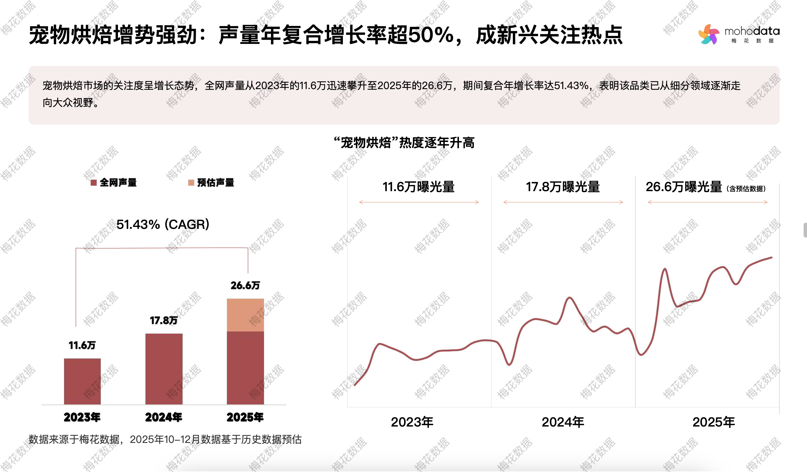 宠物烘焙是跨界烘焙行业和宠物经济的新兴赛道,聚焦宠物群体的饮食需求和情感陪伴。报告显示,“宠物烘焙”全网声量已从2023年的11.6万攀升至2025年26.6万,期间复合年增长率达51.43%,这表明,该品类已从细分领域逐渐走向大众视野。
