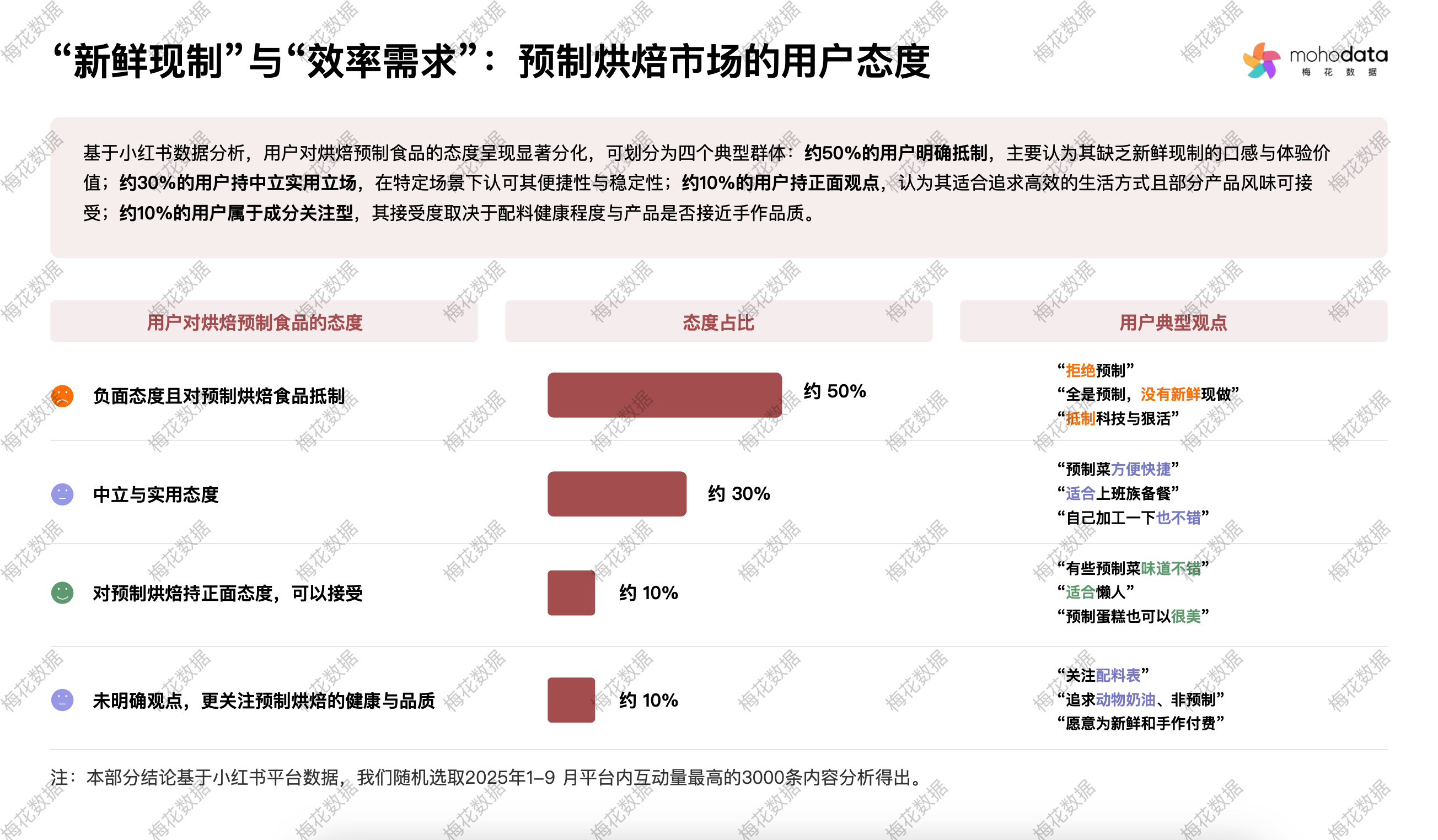预制烘焙因标准化高、效率提升、成本优化等优势,深受B端市场青睐,但C端消费态度呈结构分化,约50%用户明确抵制,主要认为其缺乏新鲜现制的口感与体验价值;而持正面态度,可以接受的用户约占10%,他们认为预制烘焙食品适合高效的生活方式,并且部分产品风味可接受。