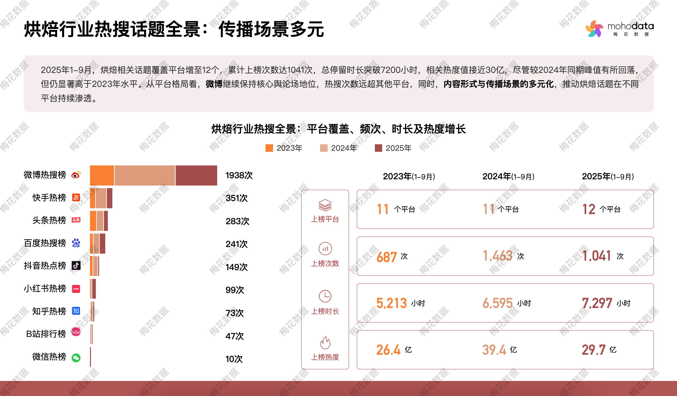 内容形式与传播场景的多元化,正推动烘焙话题在不同平台持续渗透。报告统计2025年1-9月,烘焙热搜话题共上榜12个平台共1041次,停留7297小时,相关热度值接近30亿。2025年数据较去年同期有所回落,但对比2023年同期仍有大幅增长。