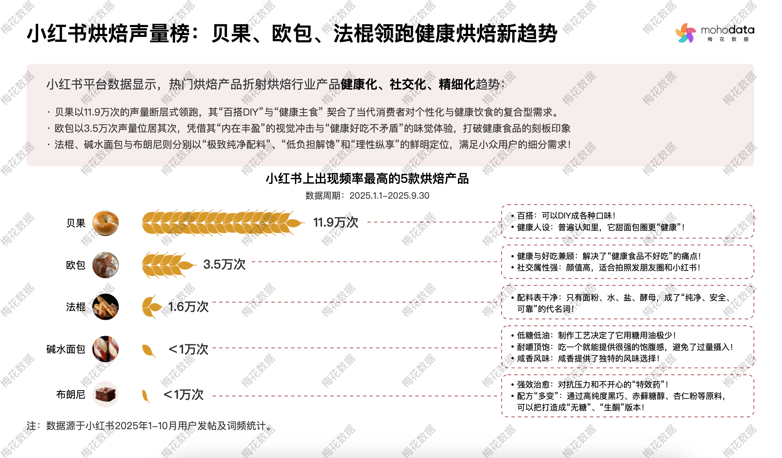 在小红书平台上,贝果、欧包、法棍、碱水面包和布朗尼是出现频率最高的烘焙产品。