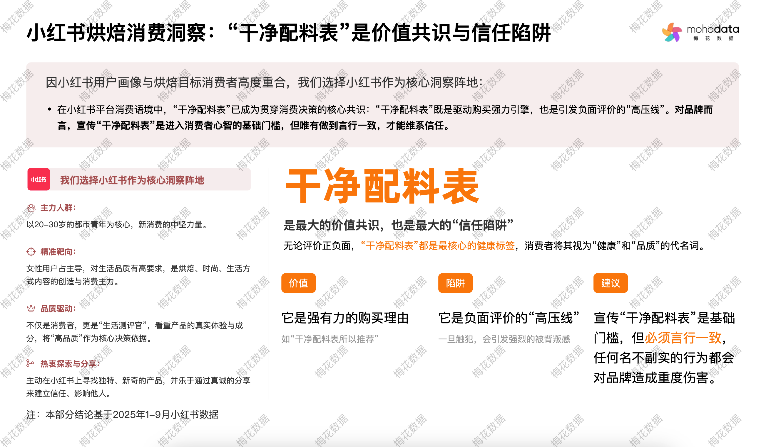 报告着重分析小红书平台数据,总结出7个烘焙消费洞察。其中,“干净配料表”是驱动用户购买的强力引擎,是进入消费者心智的基础门槛,也是负面评价的“高压线”。