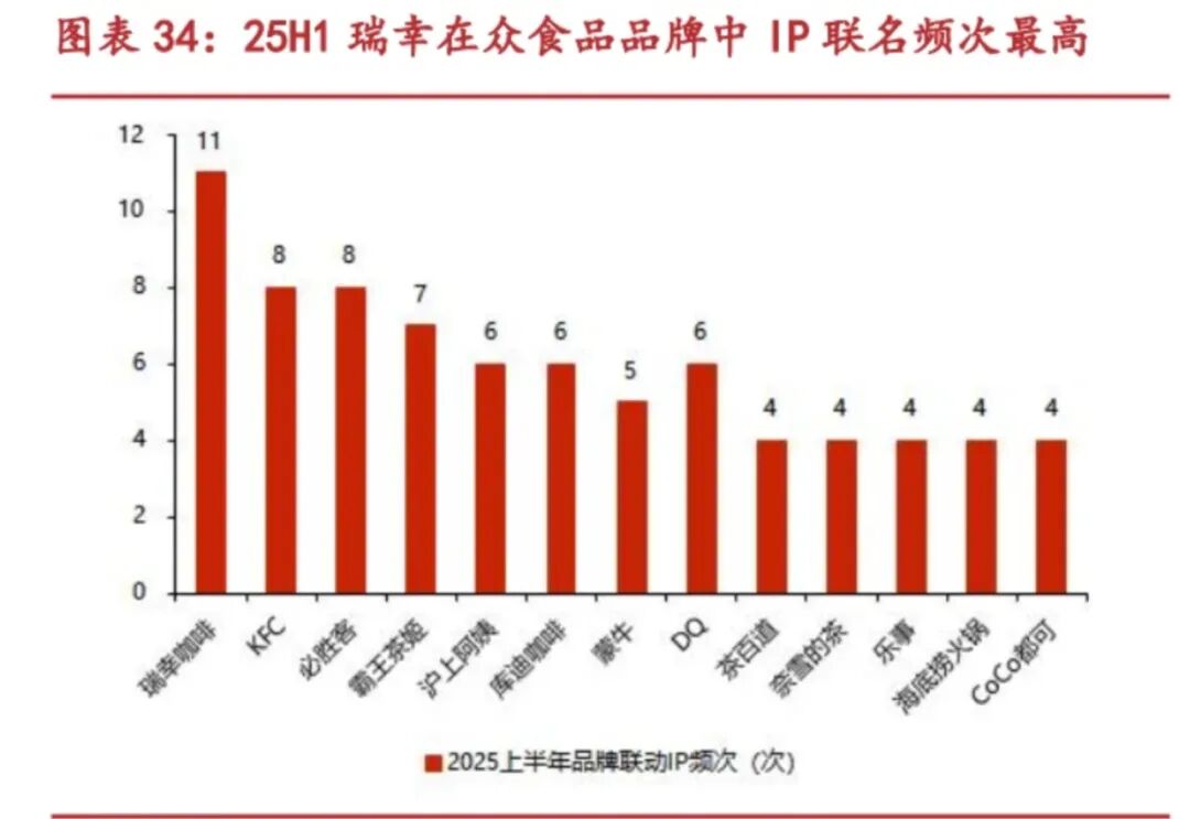 据IP角研社统计,2024年瑞幸全年联名22次,2025年上半年再启11次合作,在76个食品品牌中联名频次稳居第一,合作IP覆盖影视、动漫、文旅等多个领域。