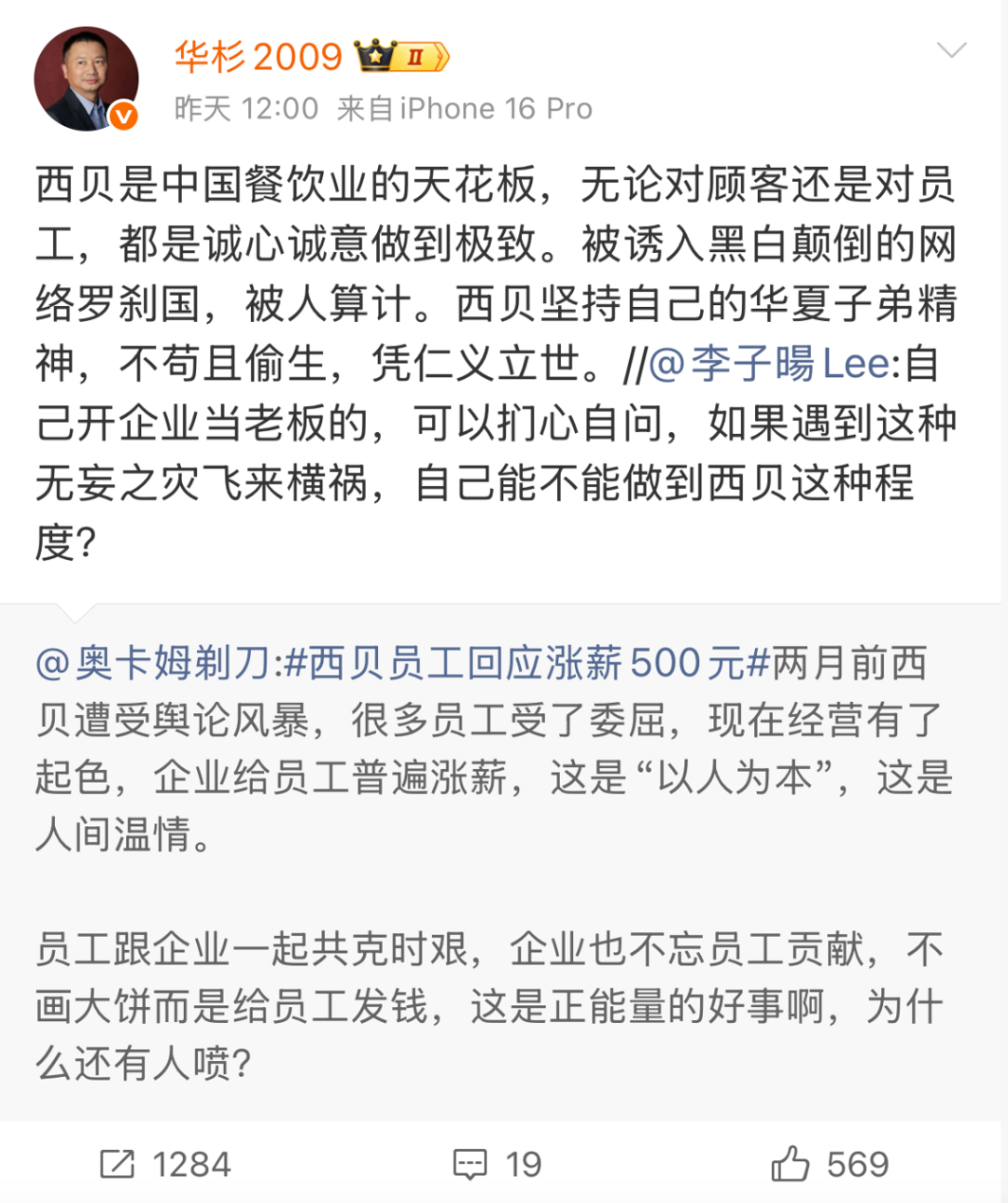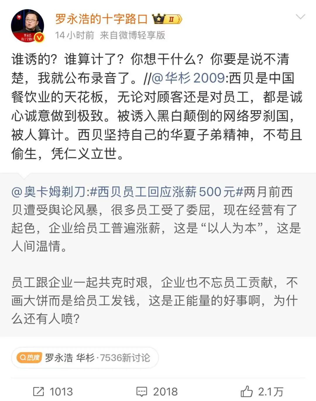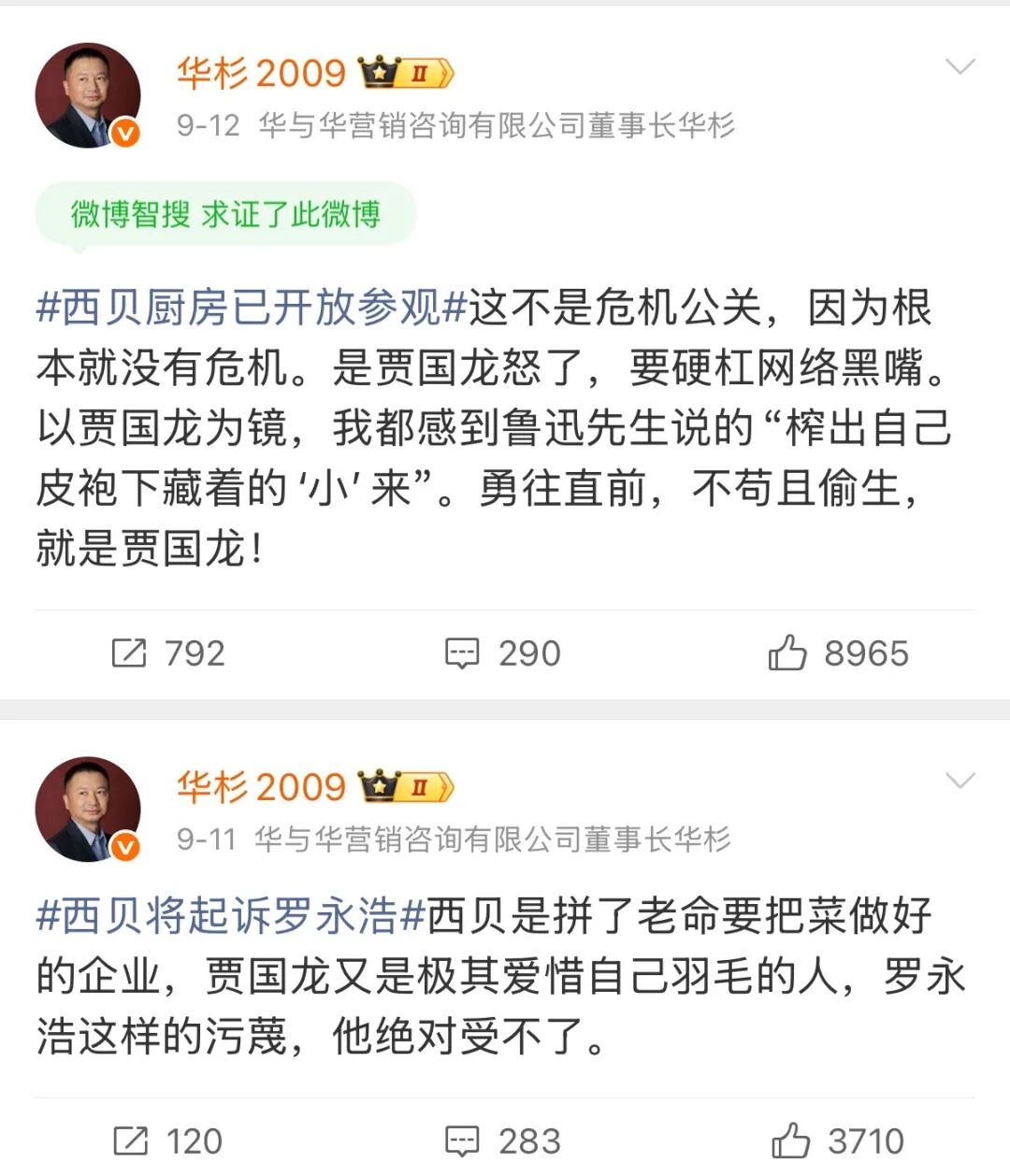此时,曾为西贝做市场定位和营销策划的华与华,其创始人华杉在微博公开力挺贾国龙,称“这不是公关危机,没有公关危机”。对此,罗永浩评价 “ 是真心想把西贝搞死”,“不顾是非对错无脑站队”。就这样,西贝的火烧到了华与华身上。