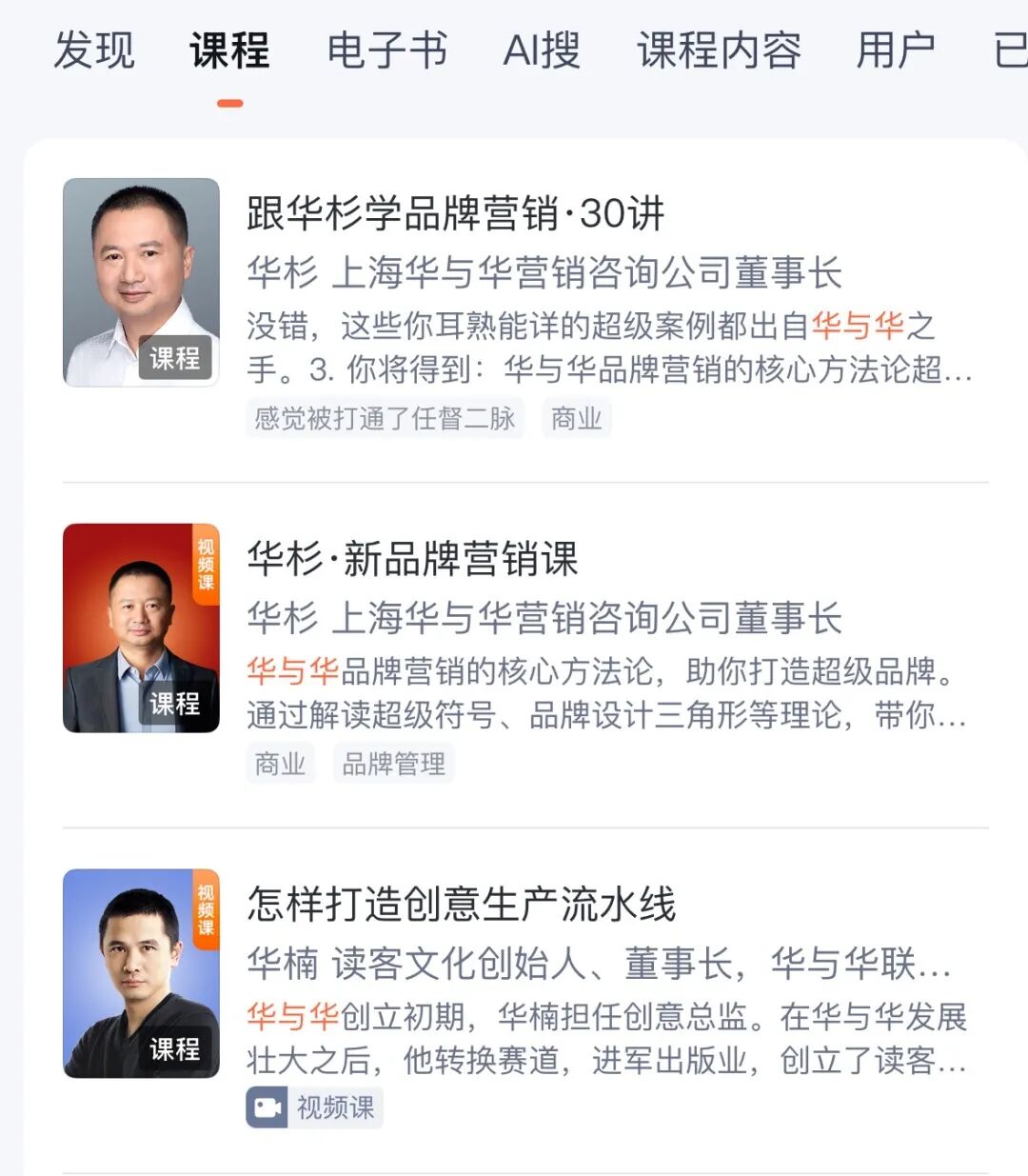 罗永浩在微博中称“已经在网上买了华与华的全集”。小编发现,在得到APP上,华与华的两位创始人共有三门课程,有一门售价99元,两门视频课则是199元。