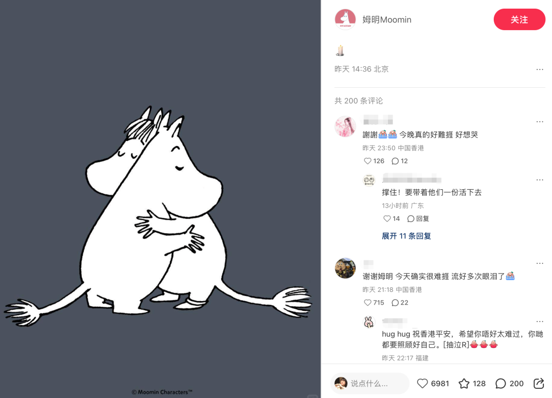 除了快速响应的艺人与企业,由芬兰作家创作的IP“姆明Moomin”也在小红书发布帖子,为香港祈福,多位香港IP的网友留言“谢谢姆明”。