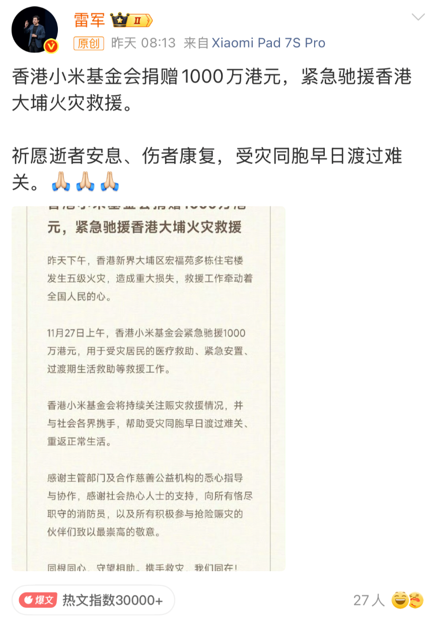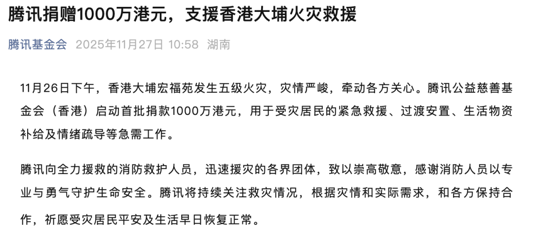 各大品牌和企业也纷纷开启援助行动。@香港小米基金会 在11月27日早上宣布捐赠1000万港元,几乎是第一个发声捐款的。随后中午,腾讯宣布捐赠1000万港元,并于当晚追加2000万港元。