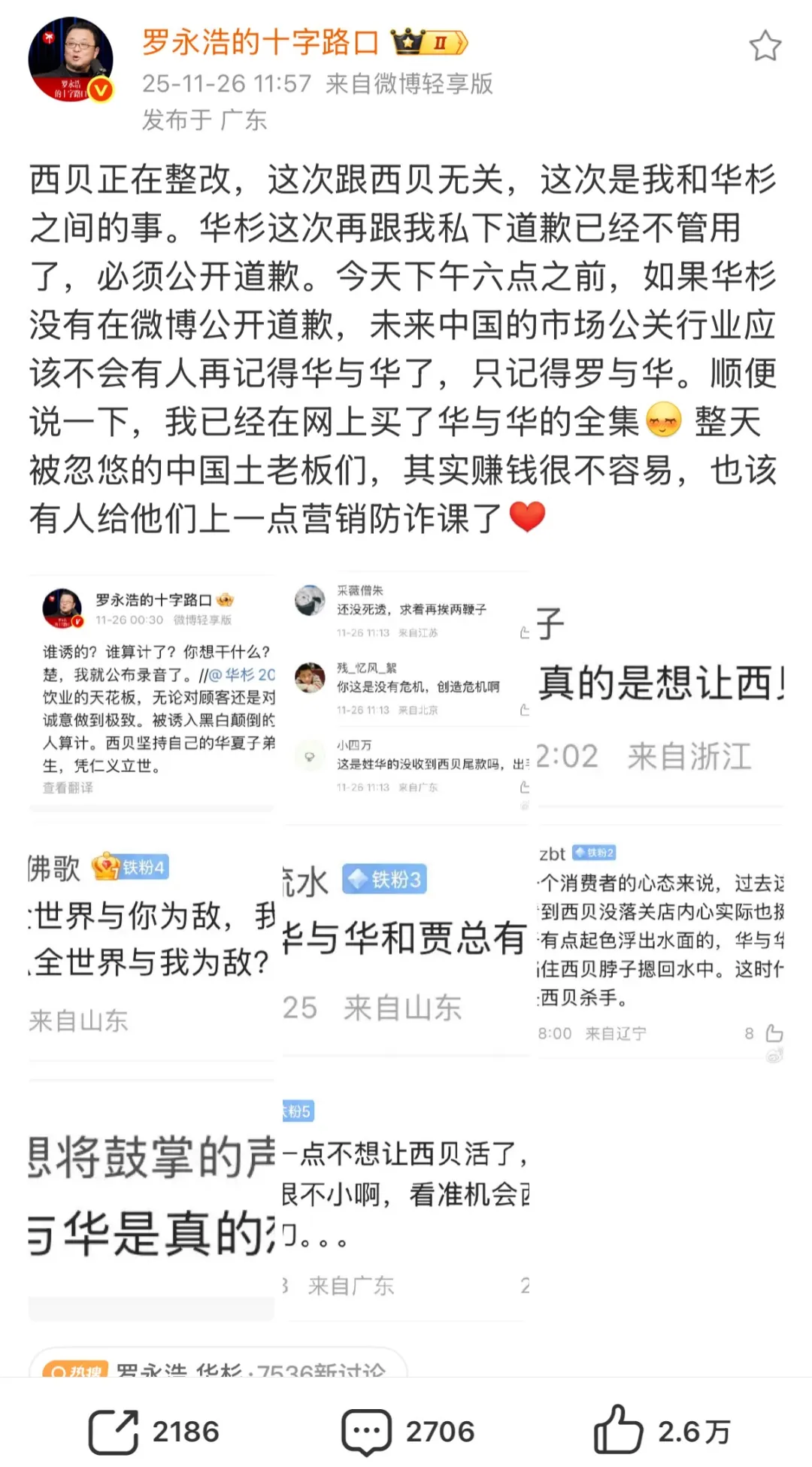 时隔两个半月,罗永浩本人的微博@罗永浩的十字路口 再次提及华杉,与前一次私下道歉不同,这次罗永浩要求对方当天下午六点前在微博公开道歉。对于华杉在微博赞扬西贝时使用“被诱入”“被人算计”等词,罗永浩表示“要是说不清楚,就公布录音”,“要是没有公开道歉, 未来中国的市场公关行业应该不会有人再记得华与华了,只记得罗与华”,并提及“营销防诈课”,态度显得较为强硬。