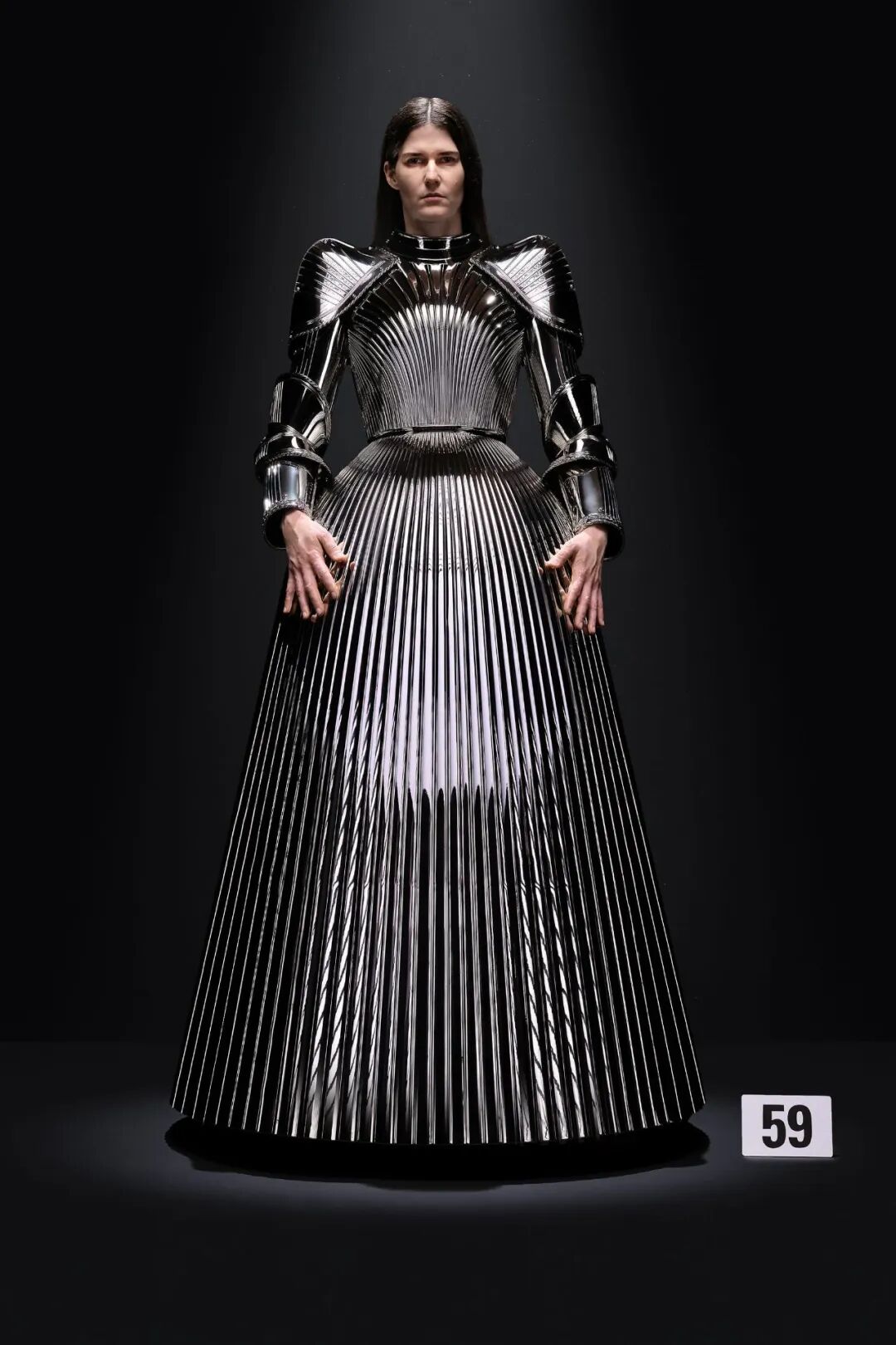品牌第25季压轴出场的“盔甲裙”也被纳入联名设计。用C4D设计、3D打印而成的镀锌树脂盔甲裙未来感十足。