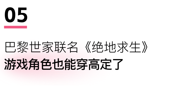 近日,巴黎世家与射击类游戏《绝地求生》官宣联名,高定秀场被搬进游戏战场,在 PC端和手游端,同时 为玩家带来多款创意皮肤、装备,有服饰、头盔、背包、墨镜等。