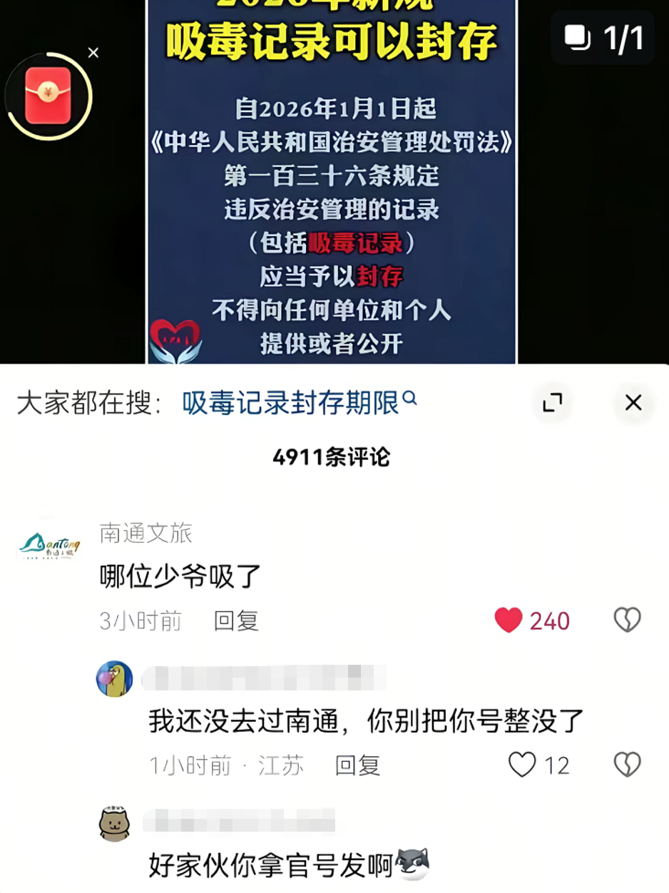 抖音账号 @兵团戒毒 发布了一条视频,提及2026年新规“吸毒记录可以封存”,并“不得向任何单位和个人提供或者公开”。11月27日,@南通文旅 官方账号在该视频底下留言“哪位少爷吸了”,并很快因该评论登上多个平台热搜。