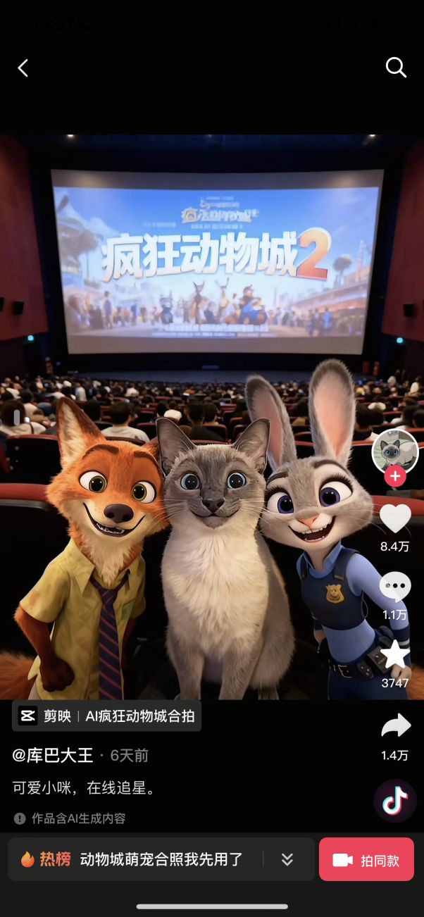 在抖音,出现一款叫做“动物城合拍”的AI特效!只要上传一张你的自拍照,就能自动生成一个和朱迪尼克合影照片为主的视频。
