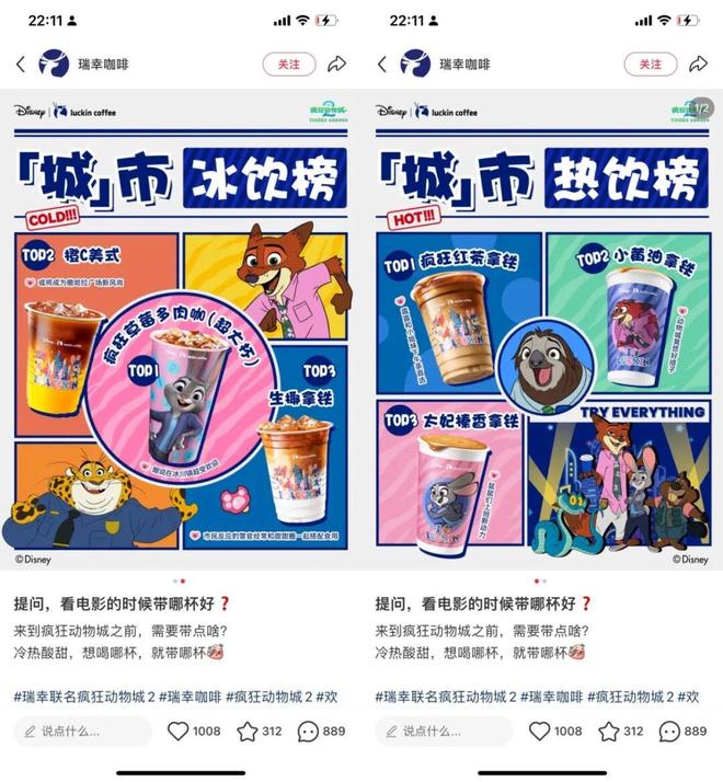此外,虽然《疯狂动物城2》这次据说做了60+的联名,包括瑞幸、星巴克、优衣库等,但起码这次瑞幸并没有爆。