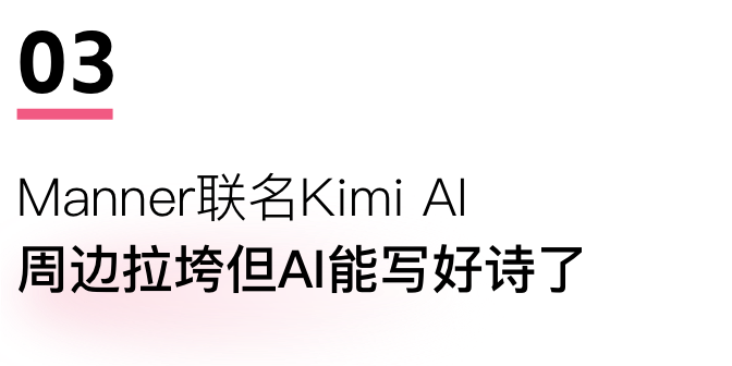 Manner官宣跨界合作Kimi AI,“工作搭子”的联名带来饮品“厚芝芝拿铁”和周边手机支架。活动吸引不少网友抢购,部分门店的联名产品和周边很快售罄。科技风的物料设计,