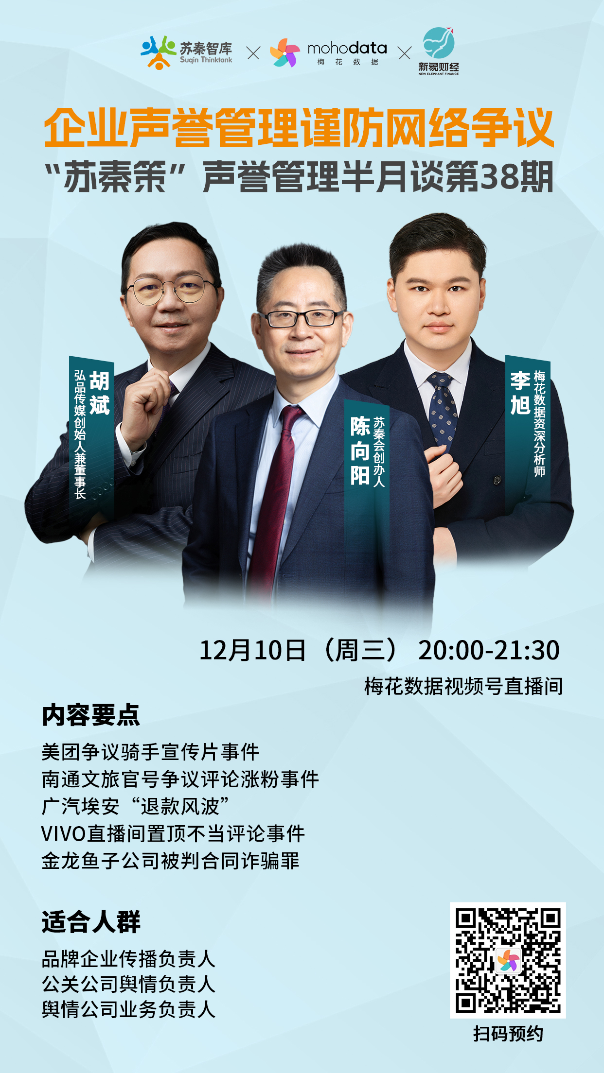 新的一周开始,上周梅花数据将携手苏秦智库举办第38期声誉管理半月谈直播,重点分析美团争议骑手宣传片事件与南通文旅官号争议评论涨粉事件,欢迎感兴趣的朋友扫码文末二维码预约直播。
