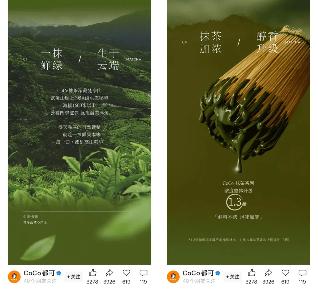 而且不少品牌都标出抹茶产地,如“浙江径山”“贵州铜仁”,小红书、抖音等平台也出现了以“铜仁抹茶之旅”为关键词的内容分享。