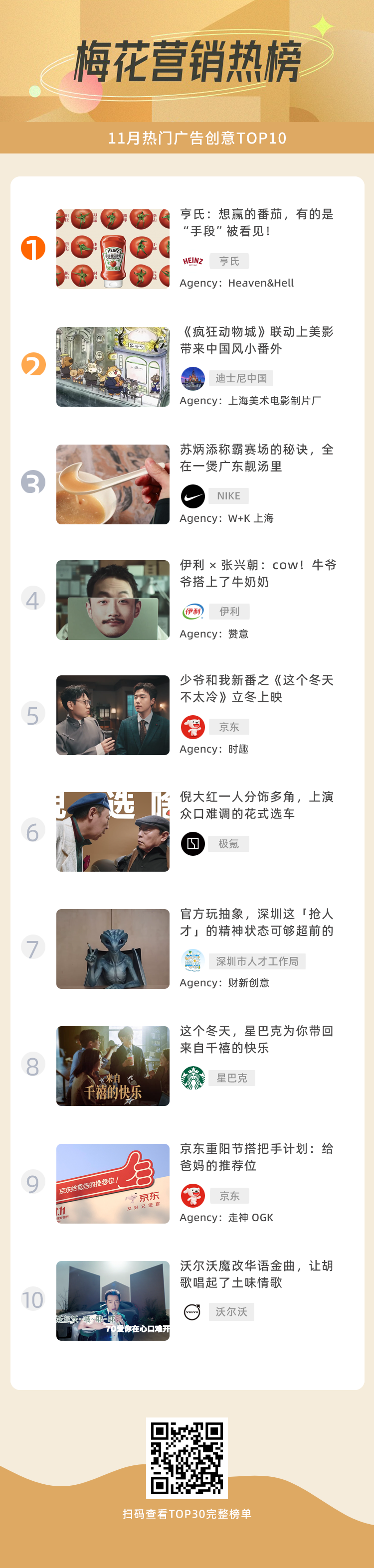 梅花营销热榜 是梅花网基于平台收录作品的点击数、喜欢数、收藏数等数据综合得出的创意榜单,11月榜单新鲜出炉!