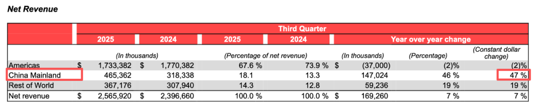 2,分区域来看,美国市场依旧疲软,销售额下降2%,但中国市场销售额大增47%,占整体营收比例也达到了18.1%,高基数的前提下同店销售额亦维持了25%的高增长。