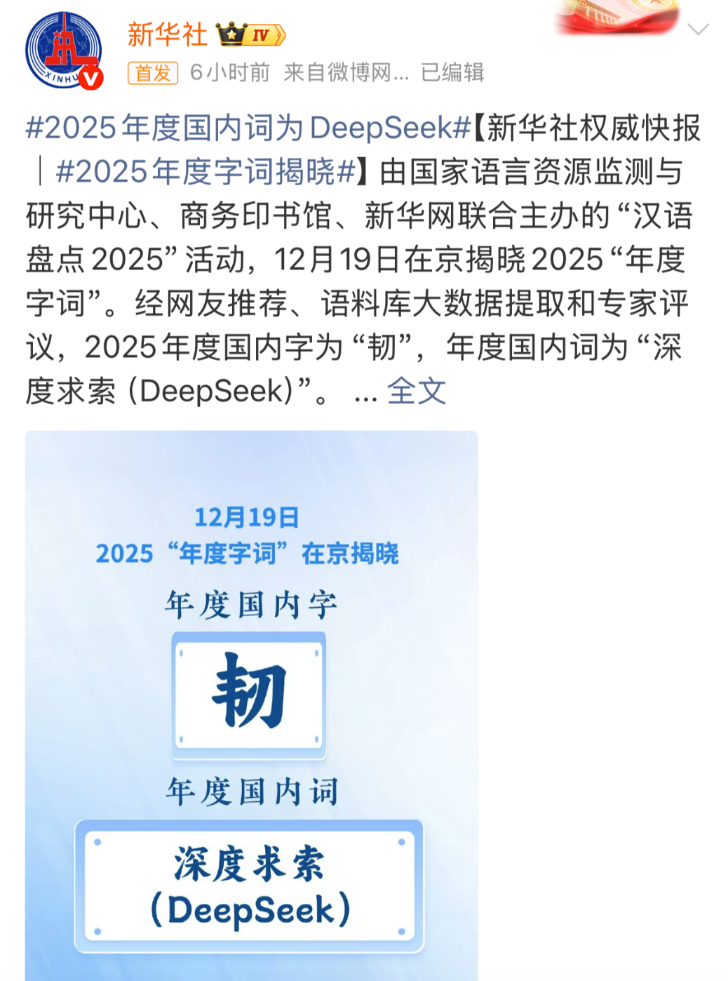 年度国内字为“韧”,年度国内词为DeepSeek AI大模型的中文名“深度求索”。