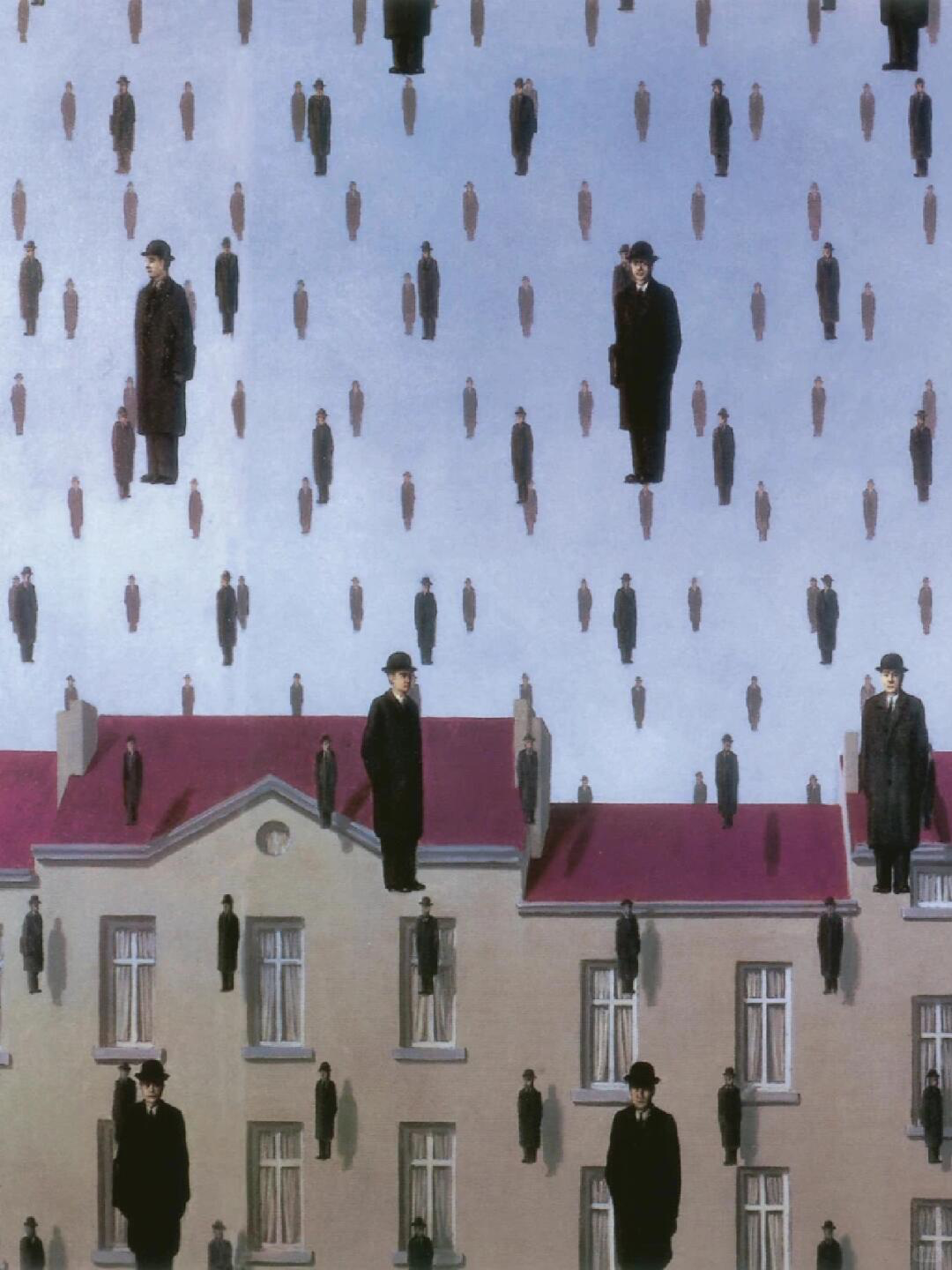 有网友提到品牌方的宣传陈列创意有点像超现实主义大师马格利特创作的世纪名画《戈尔孔达》,无数圆顶硬礼帽男士诡异地悬浮在空中,由近及远分为深、中浅三个层次。