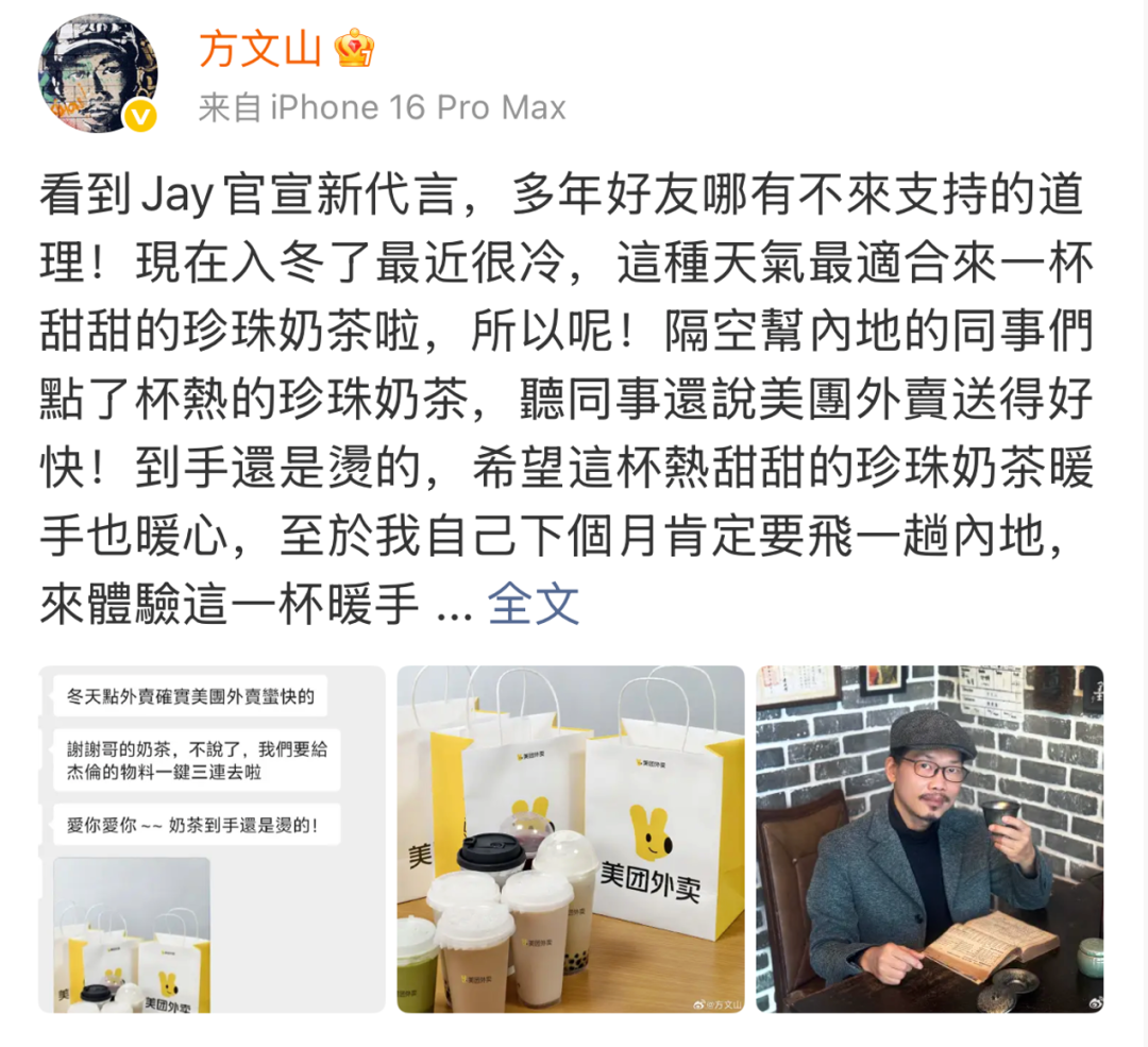 周杰伦为美团合作了两条广告片:从豪车里走出来拿外卖和下雪天坐室外长椅等外卖。两个场景让人联想到电影《头文字D》和经典的优乐美广告。